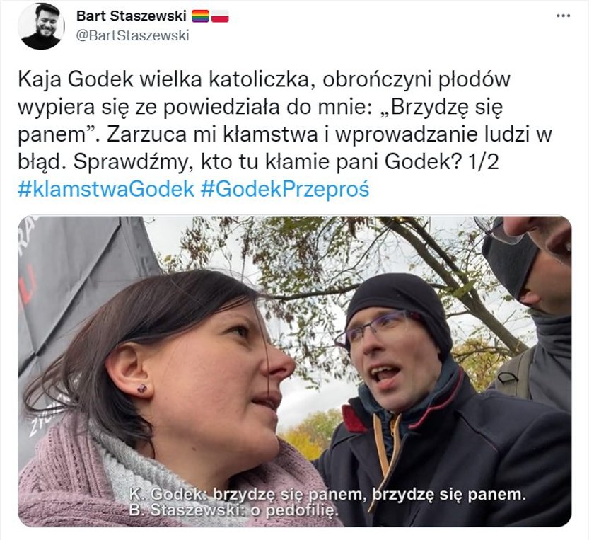 – Kaja Godek wielka katoliczka, obrończyni płodów wypiera się, że powiedziała do mnie: „Brzydzę się panem”. Zarzuca mi kłamstwa i wprowadzanie ludzi w błąd. Sprawdźmy, kto tu kłamie pani Godek? W trakcie marszu równości w Lublinie Kaja Godek pomówiła mnie o wykorzystywanie seksualne dzieci. K. Godek masz czas do czwartku, do 8:00 rano, aby mnie przeprosić, jeśli nie, to idę to sądu. Dość!!! Koniec szkalowania osób LGBT i zrównywania nas z pedofilami – zapowiedział Staszewski.