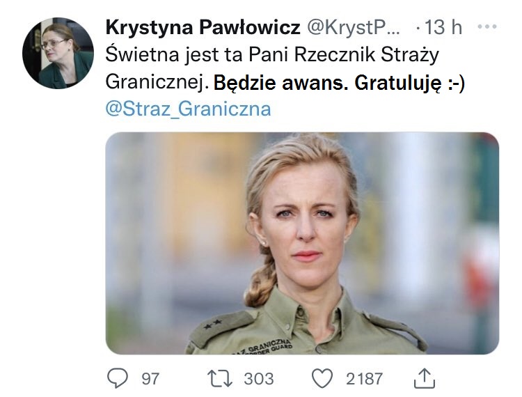 Już wiadomo że Pawłowicz pochwaliła rzecznik SG Anne Michalską – rzecznik Straży Granicznej czeka świetlana przyszłość… – będzie awans 🙂